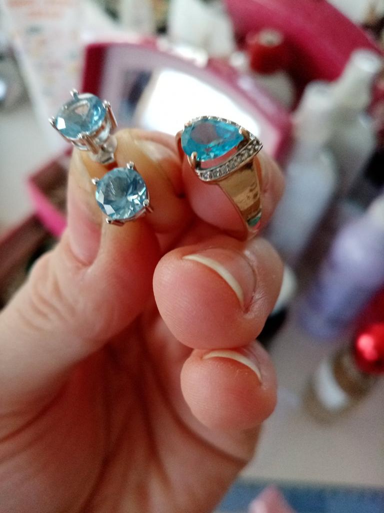 Zelta auskari. Oļi ir brīnišķīgi, maigi zilā krāsā. Pasūtījums bija firmas kartona kastē un ar pulēšanas lupatiņu