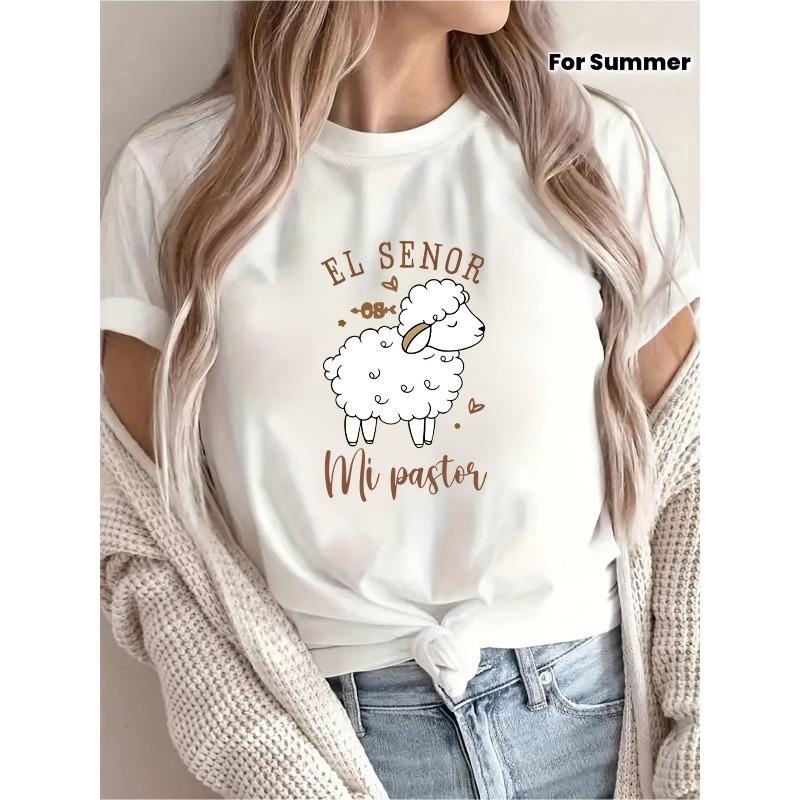 European Size Women'S Casual Short Sleeve T-Shirt with Cute Sheep & El Senor Mi Pastor Print - Black, Round Neck, Lightweight Polyester — pirkt lēti interneta veikalā Joom