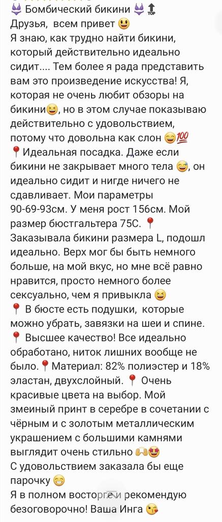 💣⭐️⭐️⭐️⭐️⭐️💣 👙 Bombebikini 🔝 Kampanjekode: 🛍JOOMDEAUGUST 🛍 for 10 % 📍 Min Telegram-kanal: Ingajoom ************************************************** Hei mine kjære 😃 Jeg vet hvor vanskelig det er å finne en bikini som virkelig passer perfekt.... Jeg er desto mer glad for å presentere dette kunstverket for deg! Jeg, som egentlig ikke liker anmeldelser for bikinier😆 men jeg kan virkelig ikke skjule det for deg! Det er helt utrolig! 📍Perfekt passform. Selv om bikinien er litt trang, ligger den perfekt på kroppen og ingenting klemmes noe sted. Mine mål er 90-69-93cm. Jeg er 156 cm høy. BH-størrelsen min er 75C. 📍 Jeg bestilte bikinien i størrelse L og den passer perfekt. Toppen kunne vært litt større for min smak, men jeg synes den er veldig vakker, bare litt mer sexy enn jeg er vant til 😆 📍 Topp kvalitet! Alt er perfekt ferdig, ingen tråder å kutte i det hele tatt. 📍 Materiale: 82% polyester og 18% elastan, dobbeltlags. 📍 Ulike lekre farger å velge mellom. Slangeprintet mitt i sølv i kombinasjon med gull, ser veldig stilig ut 🙌🤩 Jeg vil gjerne bestille noen flere 😁 📍 Leveringstid: 3 uker til Tyskland. 📍 Detaljer im Video 📽 Jeg er helt fornøyd og anbefaler det uten forbehold! Din Inge 😘