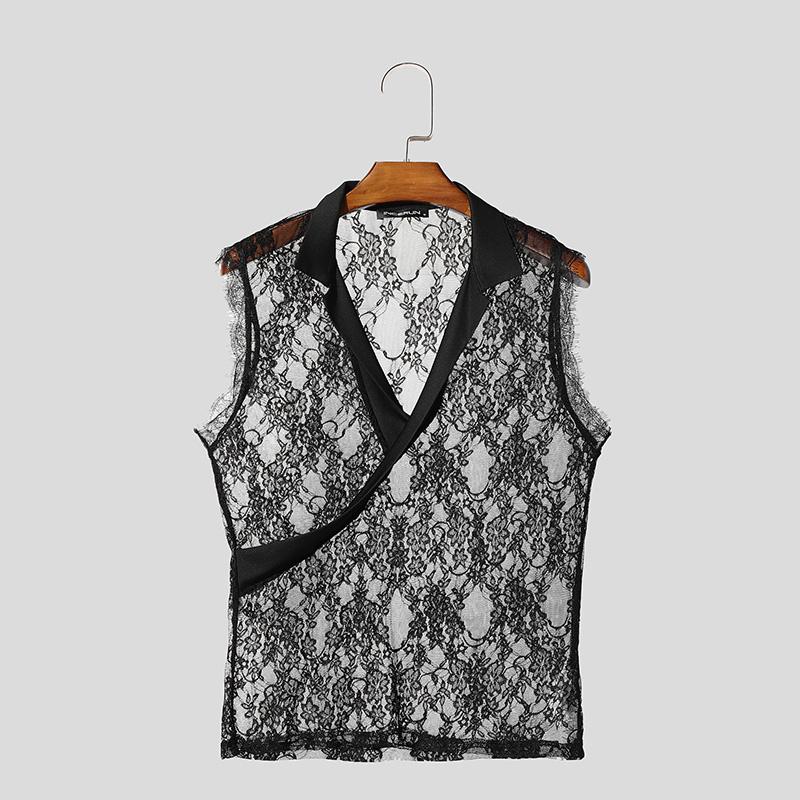 INCERUN Summer Men V Neck Sleeveless Patchwork Mesh Sheer Lace Tank Tops — kjøp varen online med gratis levering over hele verden!