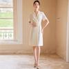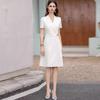Introducing a stylish and sophisticated addition to your summer wardrobe: this Women's White Slim Fit Work Dress with Short Sleeves. Expertly crafted from high-quality viscose fiber, this dress offers a comfortable and breathable wear, perfect for warmer days. Its sleek design and elegant cut create a flattering silhouette, making it a versatile choice for both professional settings and casual outings. With its classic white color and short sleeves, this dress effortlessly blends timeless style with modern appeal.