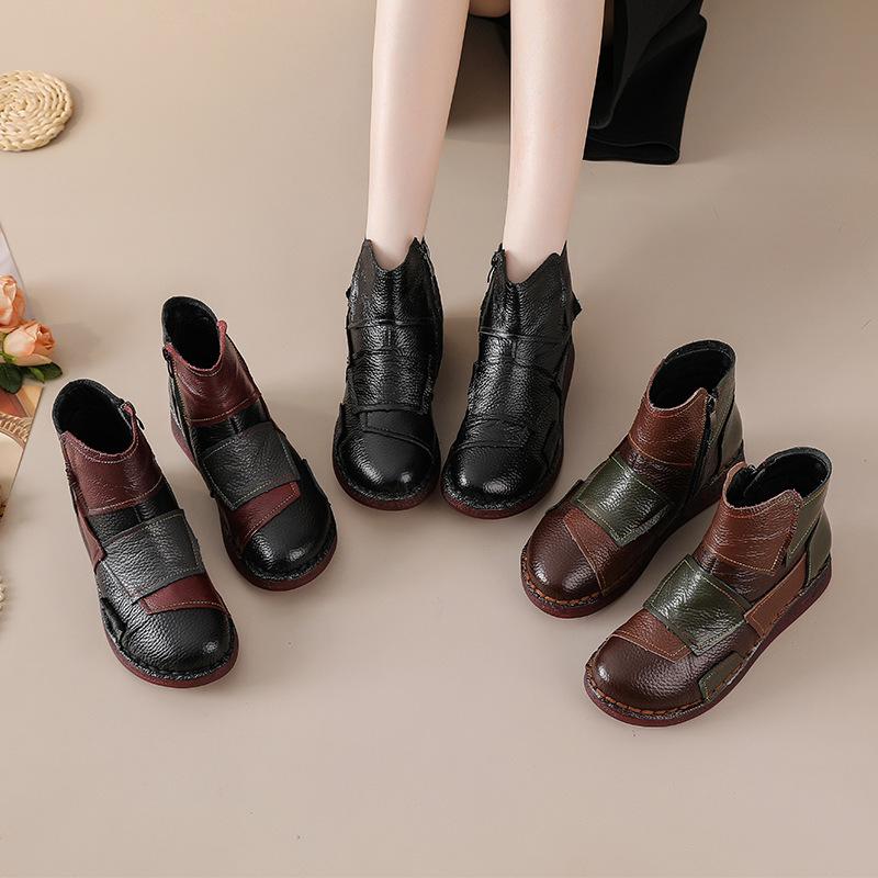 Leather short boots with color matching warm and comfortable cotton shoes women's winter cowhide sole leather boots