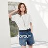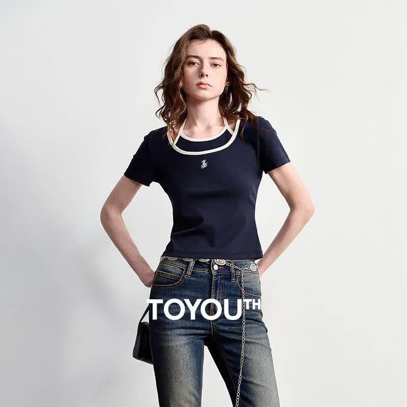 Chuyu Women's Nautical Anchor Embroidered Slim Fit Faux Two-Piece Short Sleeve T-Shirt