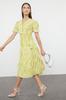 Women's Style Dress Oil Green Printed Belted Double Breasted Skirt Ruffle Knitted Dress
