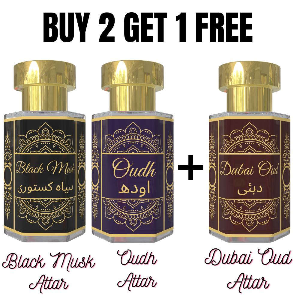 Deze combiset bevat Black Musk Attar en Oudh Attar, samen met een gratis Dubai Oud Attar, en biedt een krachtige mix van donkere muskusachtige diepte en rijke houtachtige oosterse tonen.. Alle drie zijn alcoholvrije, geconcentreerde parfumoliën die geschikt zijn voor dagelijks persoonlijk gebruik door zowel mannen als vrouwen.