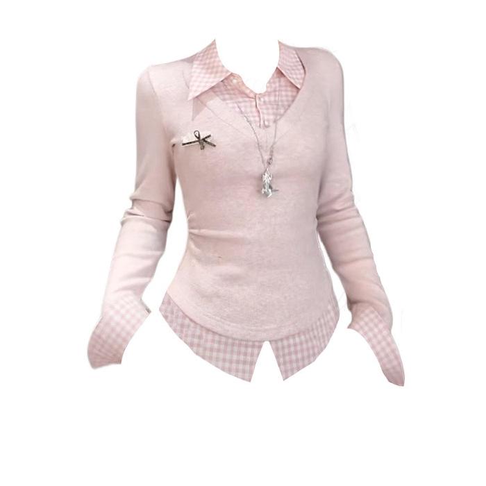 Korean Style Plus Size Plaid Patchwork Long Sleeve Shirt for Women - Autumn Waist-Cinched Slimming Top