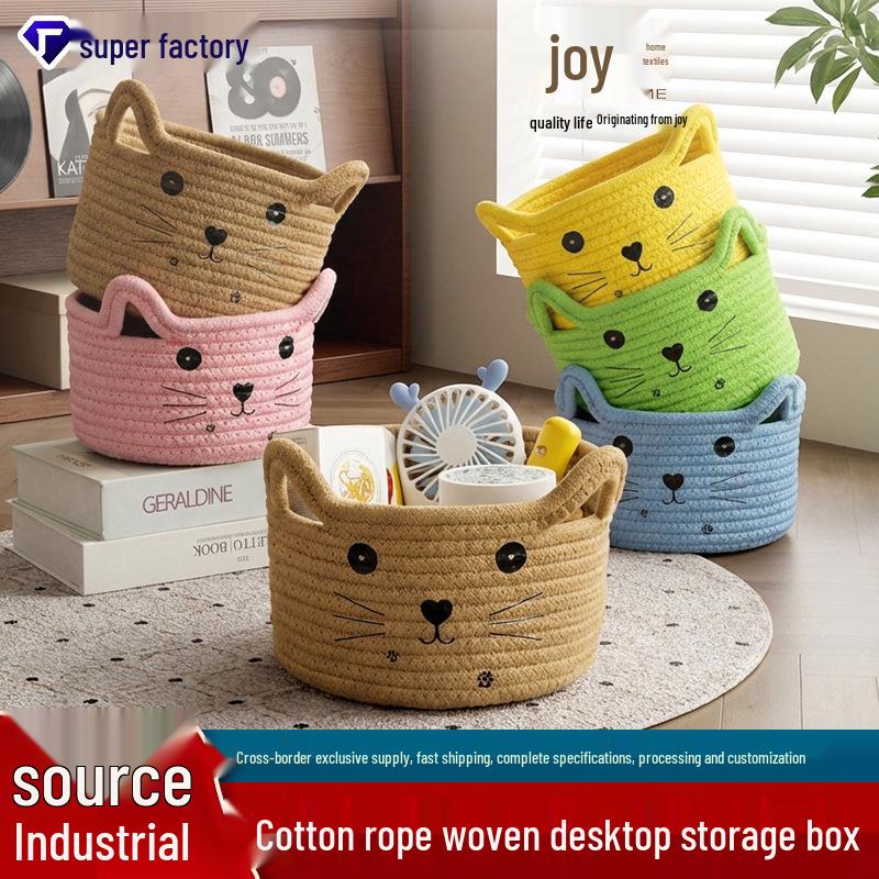 Cartoon Woven Cotton Rope Storage Basket for Cat, Remotes, Sundries, and Cosmetics