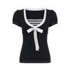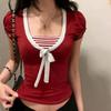 American College Style Color-Blocked Striped Bow Tie Patchwork Short-Sleeve T-Shirt, Sweet and Youthful Waist-Cinching Elegant Top