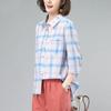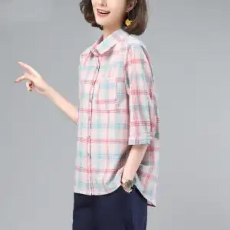 Summer Breathable Linen Top Women's Pink Blue Plaid Collared Shirt