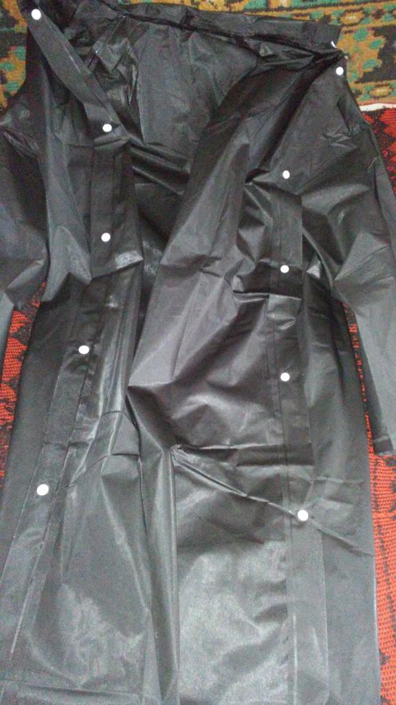 Obwód wynosi 102 cm, więc płaszcz przeciwdeszczowy można założyć tylko na T-shirt. Zapina się jak u kobiet od prawej do lewej