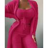 Damski pluszowy 3-częściowy garnitur piżamowy sznurowany, casualowy, jednolity kolor, obcisłe spodnie na ramiączkach, długa kurtka, do noszenia w domu