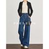 FAESSLIN Dark Blue Faux Denim Wool Wide-Leg Casual Pants