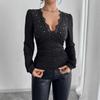 Nowa Jesienna Damska Koszulka z Jednolitego Koloru z Dekoltem V, Koronkowymi Wstawkami, Dżetami, Bocznymi Plisowaniami