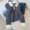 Damski szary dzianinowy sweter Color Block z kołnierzem - jesienny wygląd dwuczęściowy — kup artykuł online z bezpłatną dostawą na cały świat!