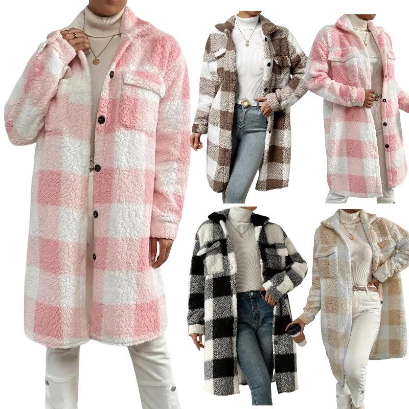 Jesienno-zimowy płaszcz pluszowy w kratę z klapami zapinany na guziki, luźny, temperamentny, do pracy, długi płaszcz dla kobiet — kup artykuł online z bezpłatną dostawą na cały świat!