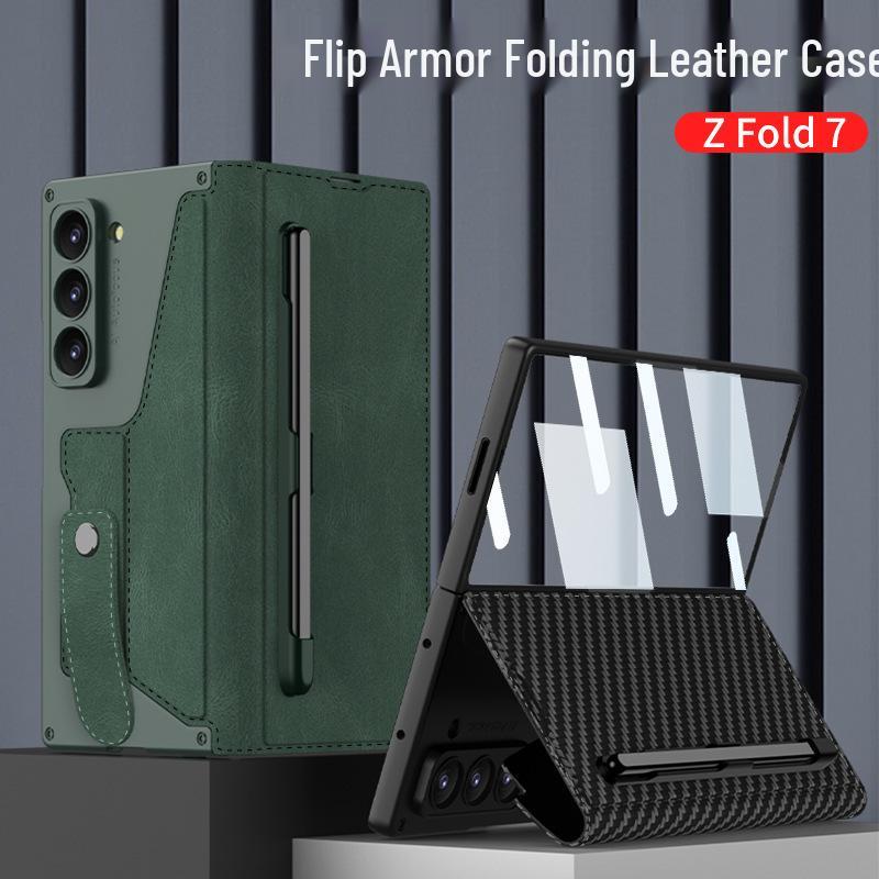 Samsung Z Fold7 Business Style Armor Flip Case with Pen Slot, Card Holder, and Screen Protector.