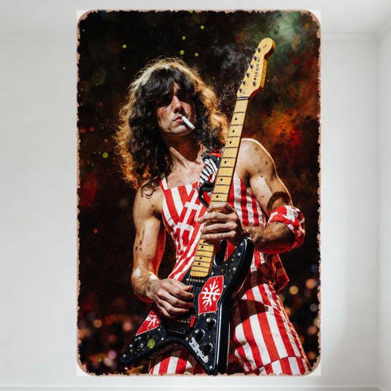 Muscular Man with Long Brown Hair Playing Black Electric Guitar Red Star Logos Vintage Tin Sign for Concert Man Cave Bar Home De