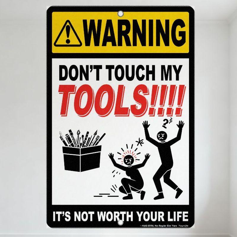 WARNING DON’T TOUCH MY TOOLS Metal Tin Sign with Tool Illustrations and Safety Message 'IT’S NOT WORTH YOUR LIFE' for Man Cave G