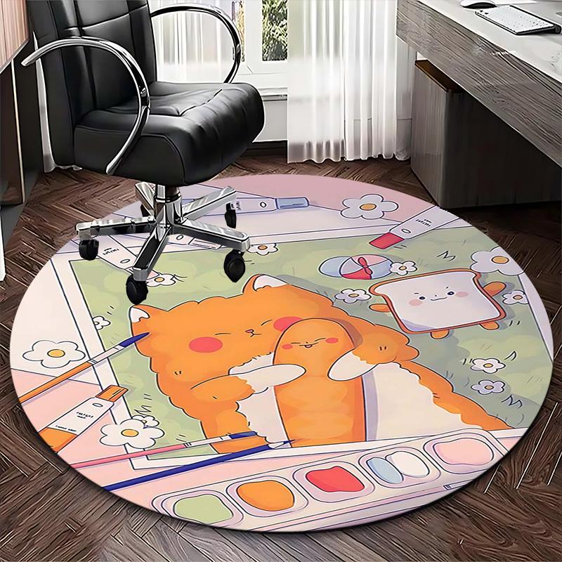 1pc Anime Design Round Carpet Cute Cat and Bread Friends Office Chair Mat, Non Slip Rug for Home Decor, All Seasons
