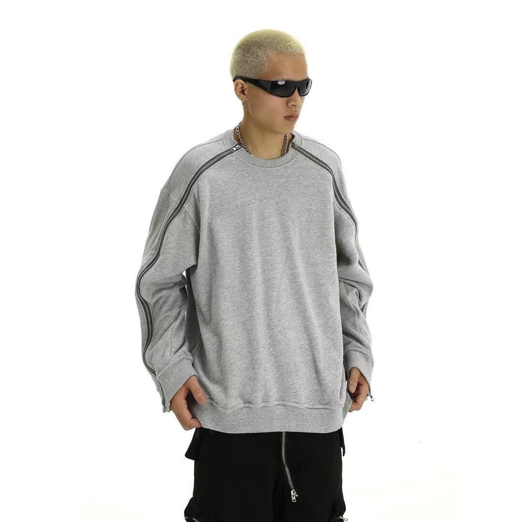 Męska Szara Bluza z Kapturem Heavyweight z Okrągłym Dekoltem, Dwukierunkowym Zamkiem Błyskawicznym, Łatkami i Obniżonymi Ramionami — kup artykuł online z bezpłatną dostawą na cały świat!