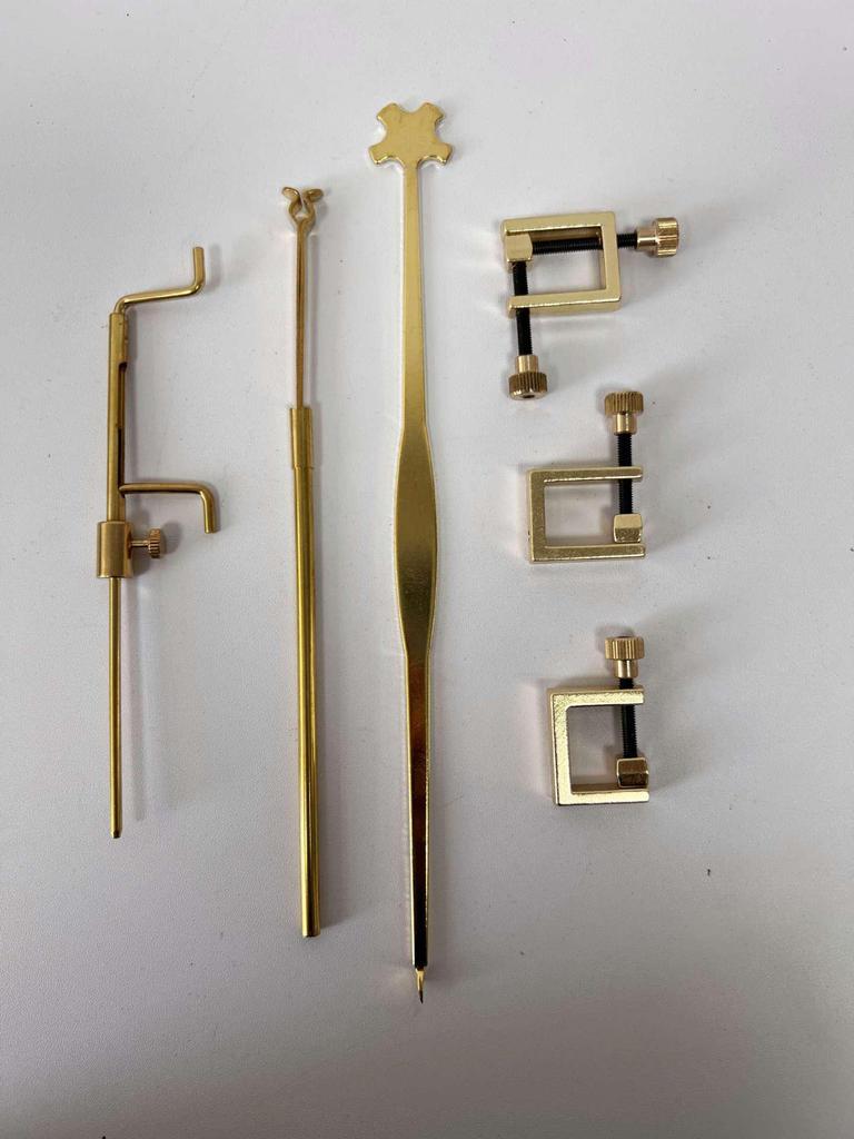 Zestaw narzędzi do skrzypiec: Haczyk do ślimaka, Zacisk, Suwmiarka długościowa, Kwadratowy zacisk mosiężny, Zacisk żeber