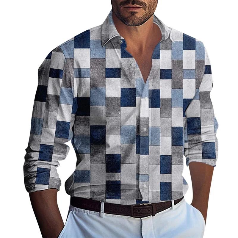 Nowa męska koszula z długim rękawem, codzienna moda, wzór w kratkę 3D, zapinana na guziki, klasyczna koszula, top