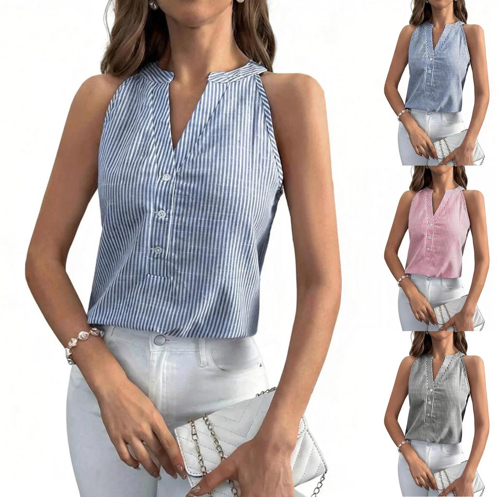 Damski modny top w paski z dekoltem w serek, na guziki, bez rękawów — kup artykuł online z bezpłatną dostawą na cały świat!