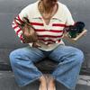 Damski sweter dzianinowy z kołnierzykiem polo, czerwono-białe paski, dekolt V, długi rękaw, casualowy, dopasowany top