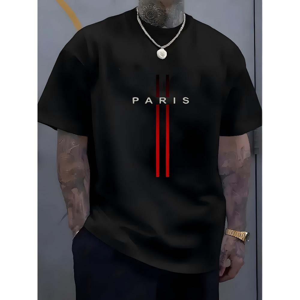 European sizes Men's Paris Graphic Print T-Shirt - Soft Round Neck, Slightly Stretchy Street Style, Breathable All-Season Casual Tee, Machine Washable