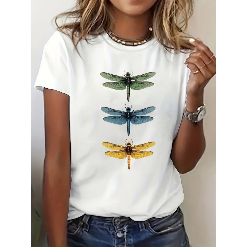 Europejski Rozmiar Damska casualowa koszulka z nadrukiem ważek - krótki rękaw, okrągły dekolt, jednokolorowa, seria wiosna i lato, biała, unikalny design z ważkami — kup artykuł online z bezpłatną dostawą na cały świat!