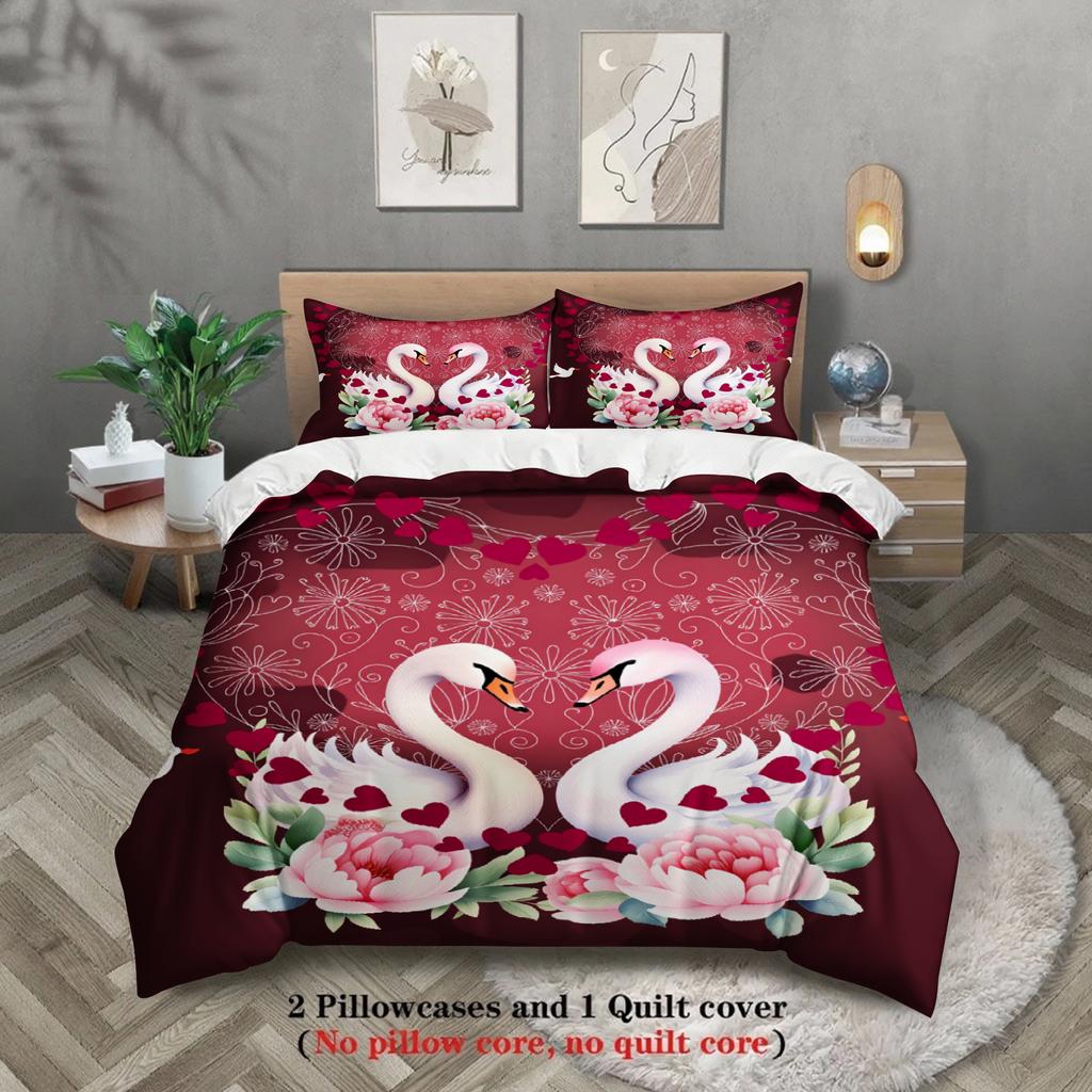 3pcs Swan Couple Bedding Sets 3D Printed Red Flora King Full Size For Couples Gifts Duvet Cover With 2 Pillowcases For Bedroom