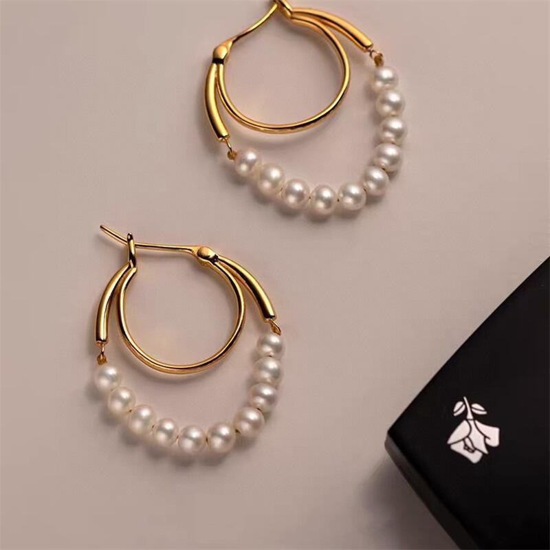 Kolczyki z naturalnych pereł słodkowodnych - Podwójny okrągły nausznica ze złota 14K, Modna minimalistyczna biżuteria dla kobiet
