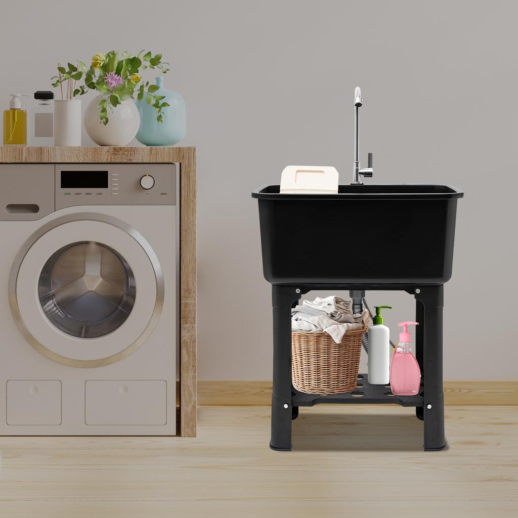 Freestanding Utility Sink with Faucet, Storage Shelf & 360° Adjustable Spout - Black PP Modern Laundry Tub, Single Hole Faucet