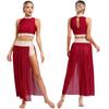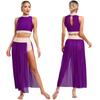 S-XL Womens Shiny Rhinestones Lyrical Dance Outfit Mock Neck Sleeveless Keyhole Back Crop Top with Side Split Flowy Mesh Skirt
