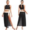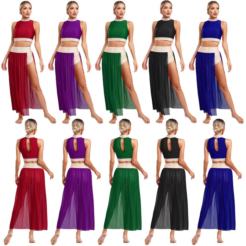 S-XL Womens Shiny Rhinestones Lyrical Dance Outfit Mock Neck Sleeveless Keyhole Back Crop Top with Side Split Flowy Mesh Skirt — kup artykuł online z bezpłatną dostawą na cały świat!