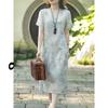 V-neck A-line Dress with Literary Bamboo Leaf Print and Frog Buttons