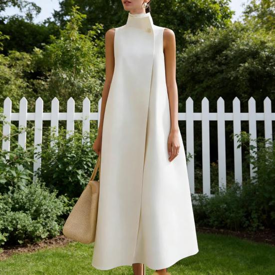 Damska Długa Sukienka z Kołnierzem Stojącym Bez Rękawów Jedno Guzik A-line Maxi Formalna Biznesowa Biurowa Sukienka do Pracy — kup artykuł online z bezpłatną dostawą na cały świat!