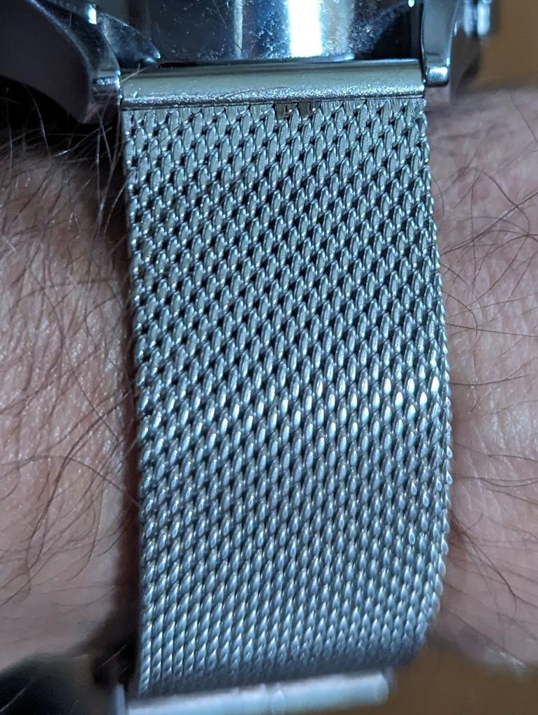 A banda tem 1,8 mm de espessura. Não 3mm. Há também alguma descoloração perceptível em três “correntes”. Parece ferrugem. Abrindo o look rápido é adicionar apenas 6 cm à circunferência da faixa. Devido a isso, mal consigo colocar a faixa aberta na mão, pois tenho pulsos pequenos/médios.