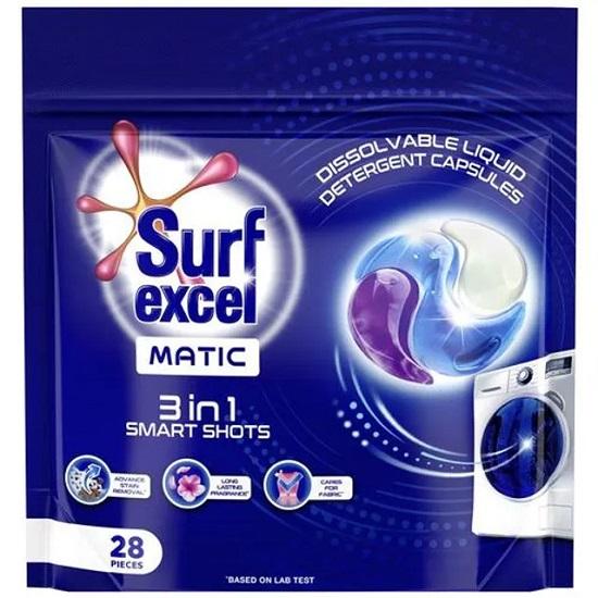 Surf Excel 3 em 1 Smart Shots para a limpeza definitiva na máquina de lavar. Um detergente de lavanderia de uso único com tecnologia inteligente de três compartimentos para proporcionar Remoção Avançada de Manchas, Fragrância Duradoura e Cuidado com os Tecidos.