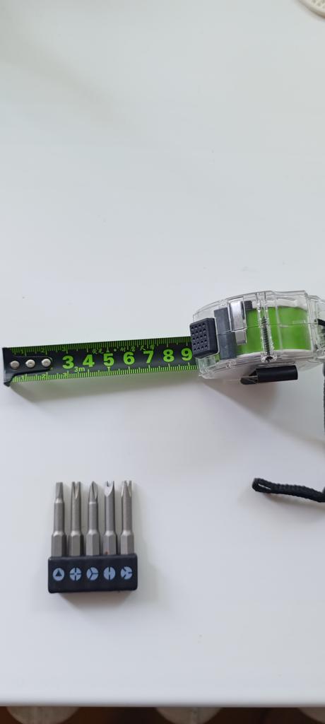 Ultimamente, tudo que chega vem danificado, não funciona bem ou faltam peças. Deveriam ter chegado seis brocas, mas falta uma, a menor delas. Estou esperando um último pedido, que acho que será literalmente o último. A fita métrica está boa, parece fraca e mal protegida contra impactos, fora isso está boa.