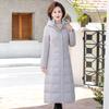 Jaqueta longa de penas de pato branco de alta qualidade para mulheres de alta qualidade, temperamento de mãe de meia-idade, jaqueta justa e elegante com corte justo no joelho
