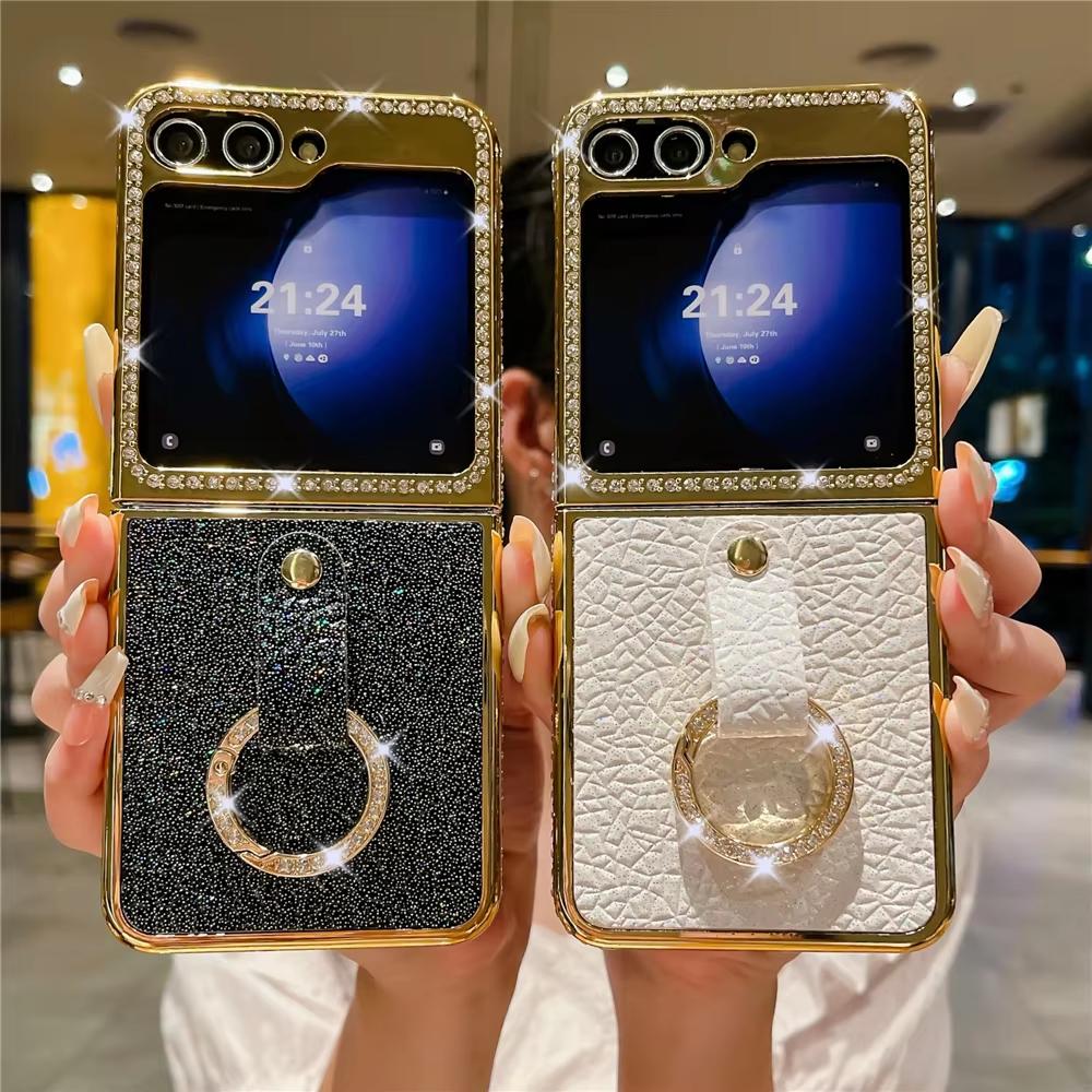 For Samsung Z Flip 6 Ring Holder PU Leather Plating Case For Samsung Galaxy Z Flip 6 Z Flip 5 4 3 Bling Diamond Shockproof Cover — comprar online na loja virtual Joom