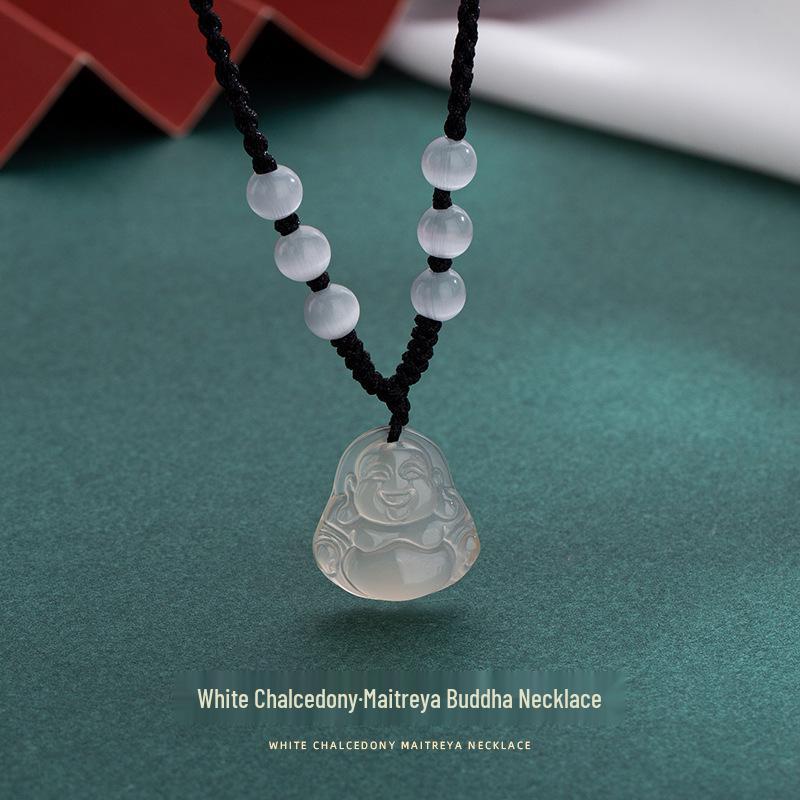 Jinruixi White Chalcedony Maitreya Buddha Pendant Necklace - Cat's Eye Stone Clavicle Chain