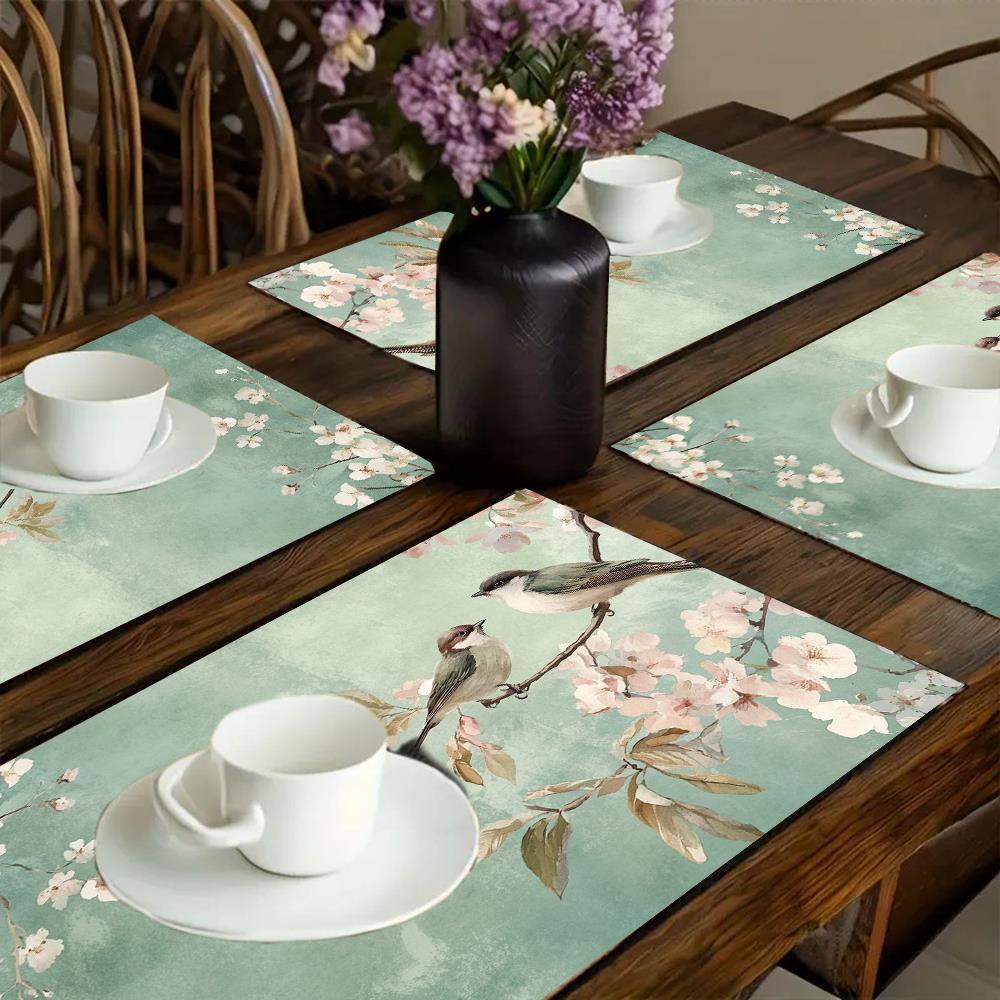 4pcs Vintage Floral Bird Placemats - Elegant Teal & Pink Table Mats, 12x18 Inch Rectangular Dining Decor for Christmas, Thanksgiving, Halloween — comprar online na loja virtual Joom