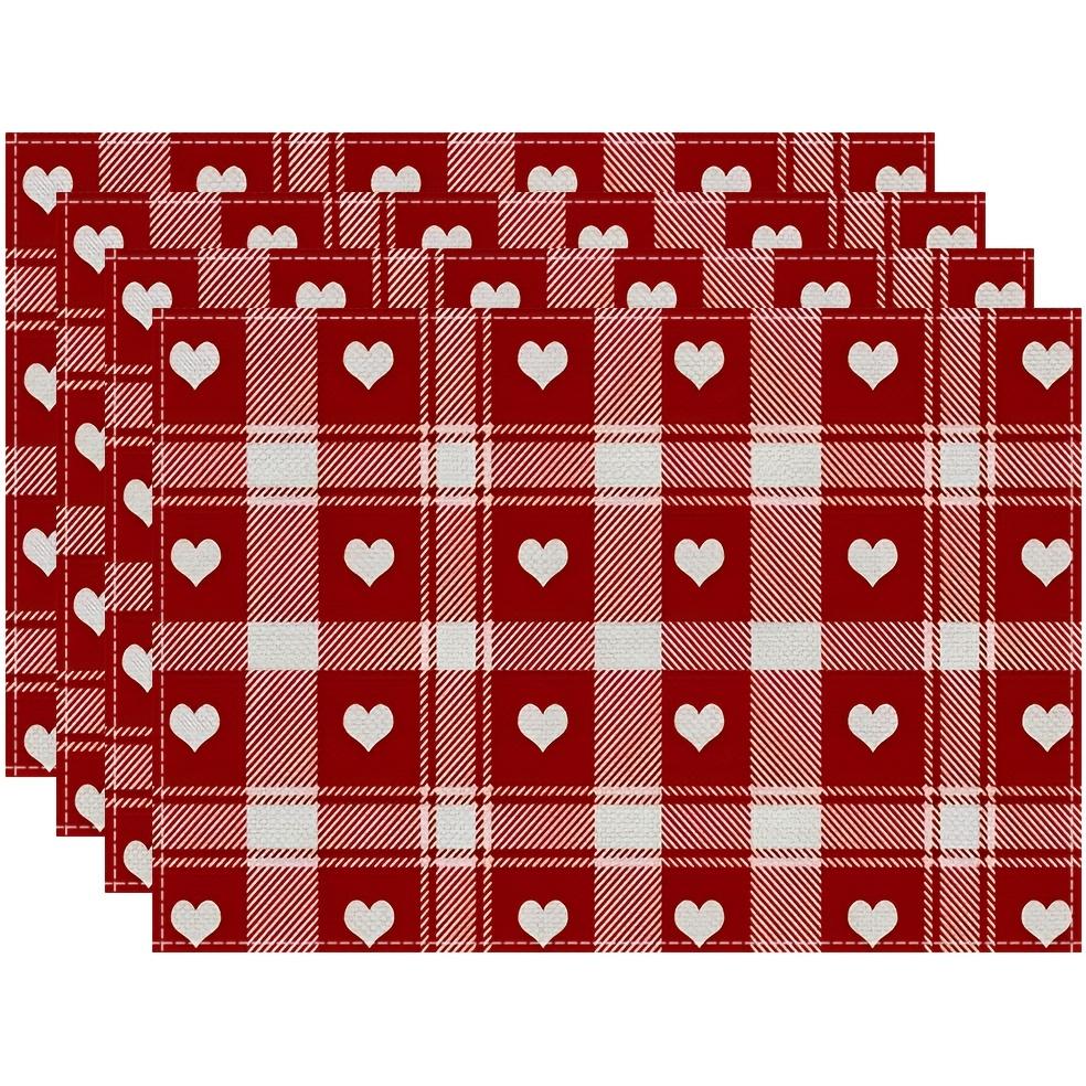 4pcs Buffalo Check Red Heart Placemats - Red & Buffalo Check with Heart Cutouts, Hand Washable Table s Suitable for Holiday Dining, Decor