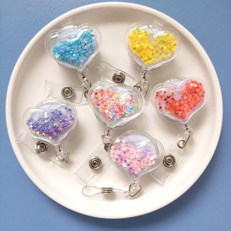New Style Name Tag with Cartoon Snap Fastener Elastic Snap Fastener Flowing Sand Heart Resin Work ID Card Hanging String Clip Clip Holder — comprar online na loja virtual Joom
