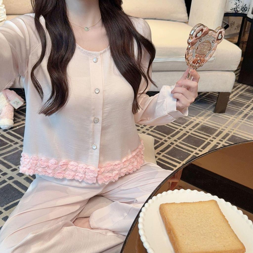 Women's Pink Floral Ice Silk Pajama Set for Fall/Winter - Sweet, Cute, and Suitable for Outdoors.