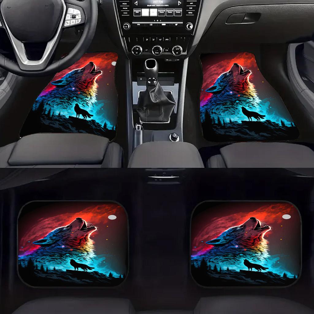 4 Peças Tapete com Estampa de Lobo Colorido Tapetes de Chão para Carro para Auto Van Caminhão SUV - Conjunto Completo Dianteiro e Traseiro Ajuste Universal Proteção Decoração do Interior do Carro