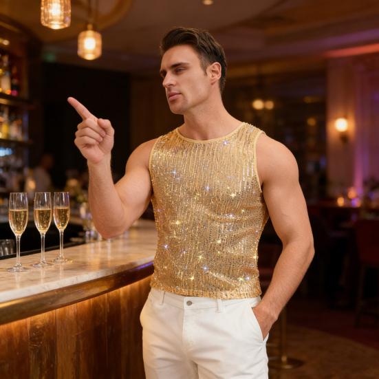 Esta regata masculina é feita de poliéster de alta qualidade, garantindo um caimento macio, respirável e confortável.. Apresentando um decote redondo clássico e um design sem mangas, oferece um visual elegante e simples que evita ser básico.. O top é adornado com strass brilhantes que cintilam lindamente sob a luz do sol ou luz artificial, adicionando um toque de glamour.