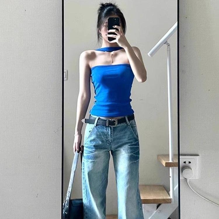 Sexy Blue Halter Neck Summer Beach Tshirt Sleeveless Slim Fit Sweet Spicy Top for Women